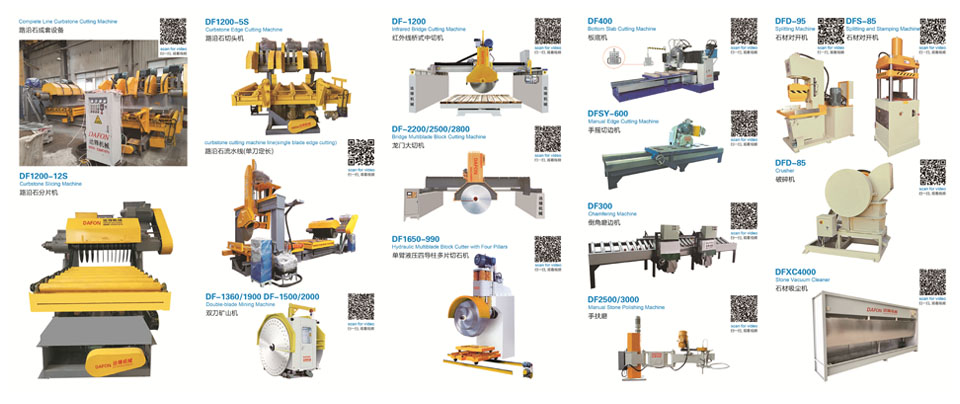 DAFON Machinery is located in Quanzhou City , hometown of overseas Chinese in southern Fujian Province,we are a professional stone machinery company integrates design, manufacture, sale as a whole. We mainly produce curbstone assembly line machine, infrared trimming machine, automatic trimming machine, infrared middle block cutting machine, single arm multi-blades cutting machine, large gantry cutting machine, bridge stone cutting machine, mining machine and all sorts of stone cutting machines.